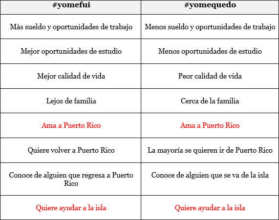 Estos son algunos de las diferencias y similitudes que tenemos los que se fueron y los que se quedaron. Quisiera entender porque persistimos en promocionar el #yomequedoaqui para continuar dividiendo lo único que nos une…el amor por la patria. Tantas iniciativas ocurriendo y muchas que echan al lado la diáspora. No somos cobardes por irnos, en todo caso somos valientes. Toma mucha valentía dejar todo lo que uno tiene por un “mejor porvenir” desconocido. Al igual, la diáspora no puede echarle la culpa a los que están en la isla por la situación actual. Como bien se mencionó en el pasado artículo de “La teoría de juego”, necesitamos unir las fuerzas del #yomefui y #yomequedo para lograr un #yosoyboricua. Todos sufrimos con la situación actual, ya sea por repercusiones directas o indirectas. Este no es el momento para darnos las espaldas…sino para unirnos por el bien de nuestra isla. ¿Qué importa si me fui? El amor a larga distancia no siempre falla, si hay amor verdadero. La diáspora tiene el mismo deseo de que su isla triunfe y puede aportar si los de #yomequedo no nos echan a un lado. Videos como el del coro del recinto de Cayey de la UPR muestran eso que nos une….el “Amanecer borincano”.